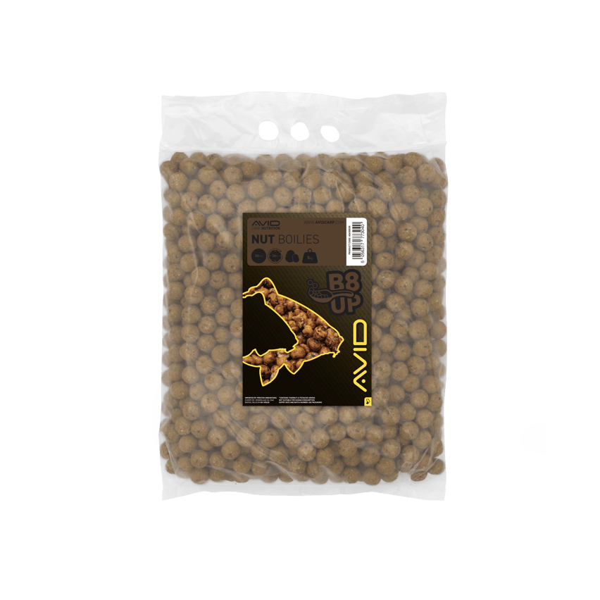 Boilies of the brand Avid Carp, range B8-Up, flavor Nut, special for carpfishing.