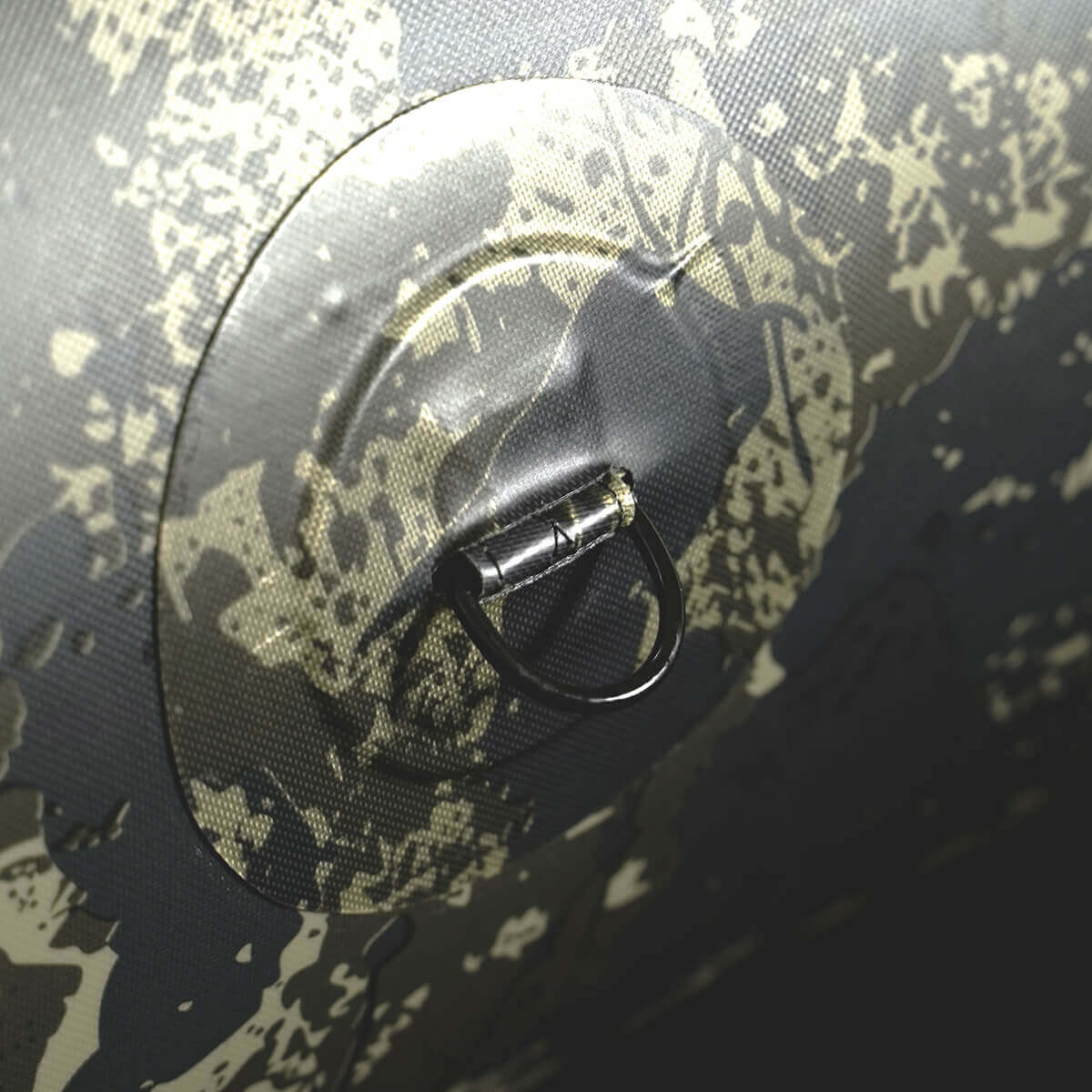 Compact boat of the brand Raptor model 230 X-Wide in camouflage color green and blackspecial for carpfishing.