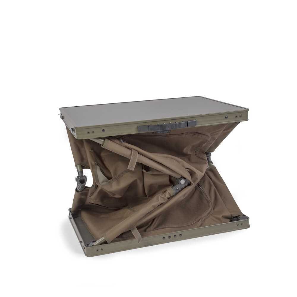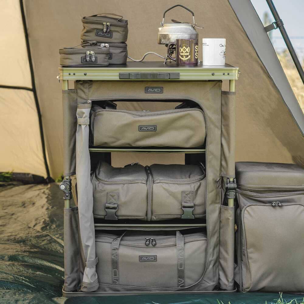 Table with organizer cabinet of the brand Avid Carp, model Quick Up Session, in camo color, special for your carpfishing sessions.
