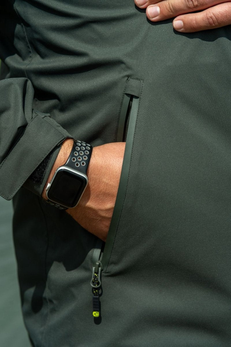 Waterproof jacket of the brand Ridge Monkey, model APEarel ThermaProin color greenperfect for your carpfishing sessions.