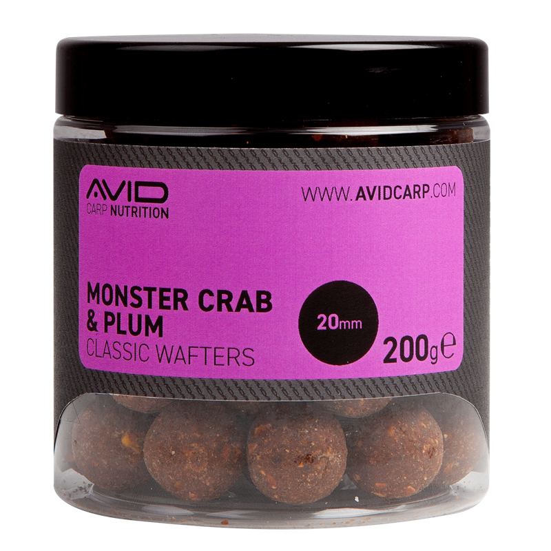 Wafters of the brand Avid Carp, range Classic, flavor Monster Crab & Plum, special for carpfishing.