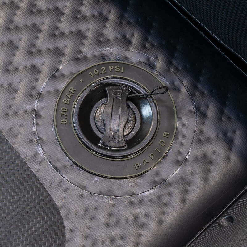 Compact boat of the brand Raptor model 270 X-Treme with aluminum floor at carbon black color, special for carpfishing.