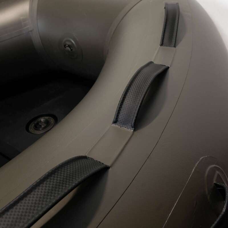 Compact boat of the brand Raptor model 270 X-Wide with air floor at green color, special for carpfishing. Design suitable for use in smaller waters and fast sessions.