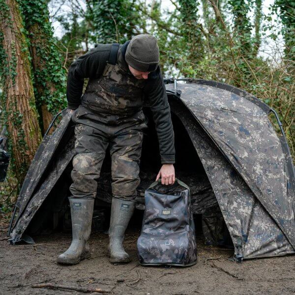 Bag for storing waders and boots of the brand Nash in color camospecial for carpfishing.