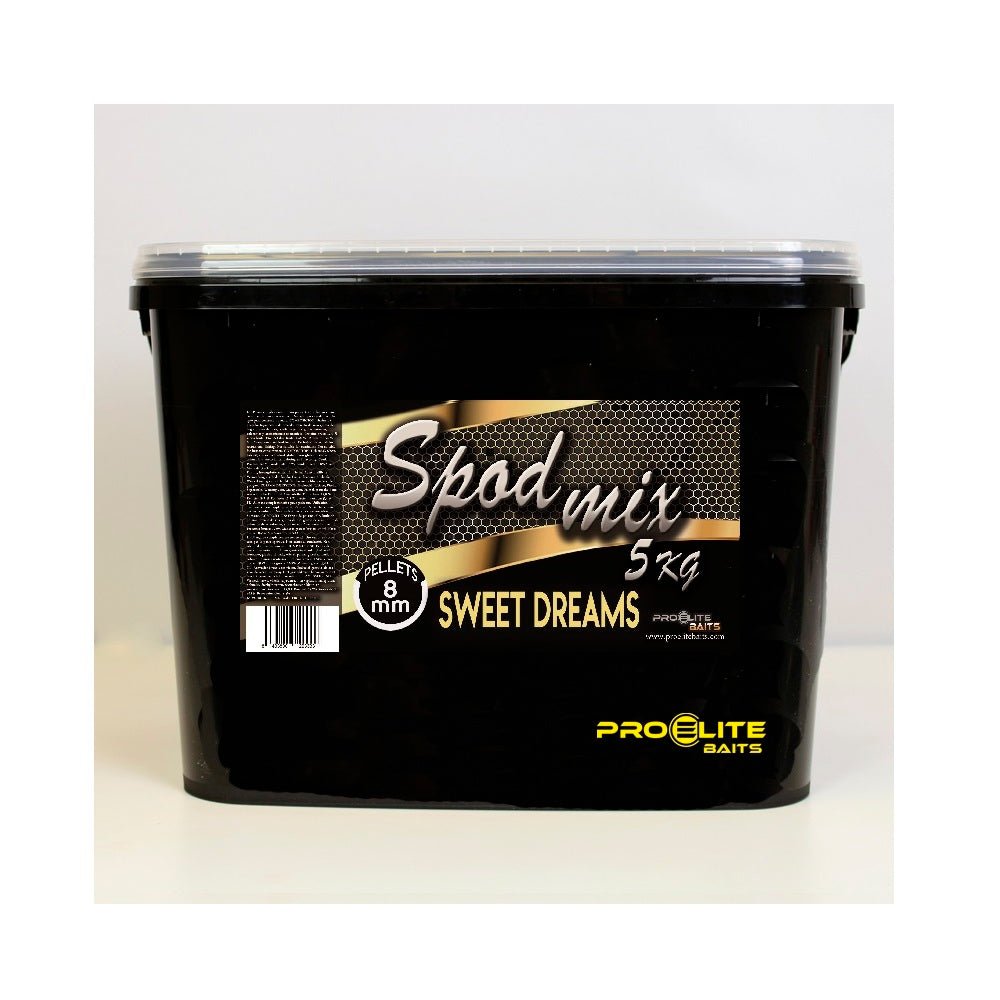 Bucket of 5 kg of mix pellets of the brand Pro Elite Baits range Gold flavor Sweet Dreams from 8 millimeters, special for carpfishing.