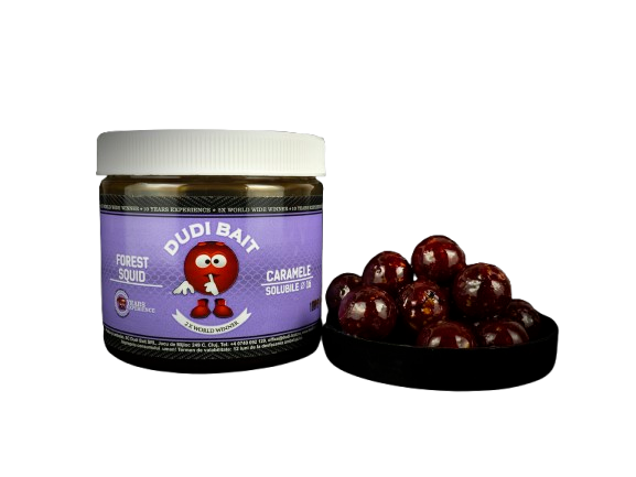 Boilies soluble selected for brand positioning Dudi Bait from 24 millimeters range Glugged flavor squid forestspecial for carpfishing.