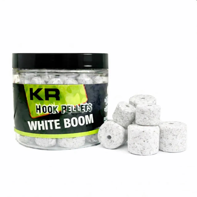 Pot of pellets brand drilling Krom Quality flavor White Boom 14 and 20 millimeters, especially for carp fishing.