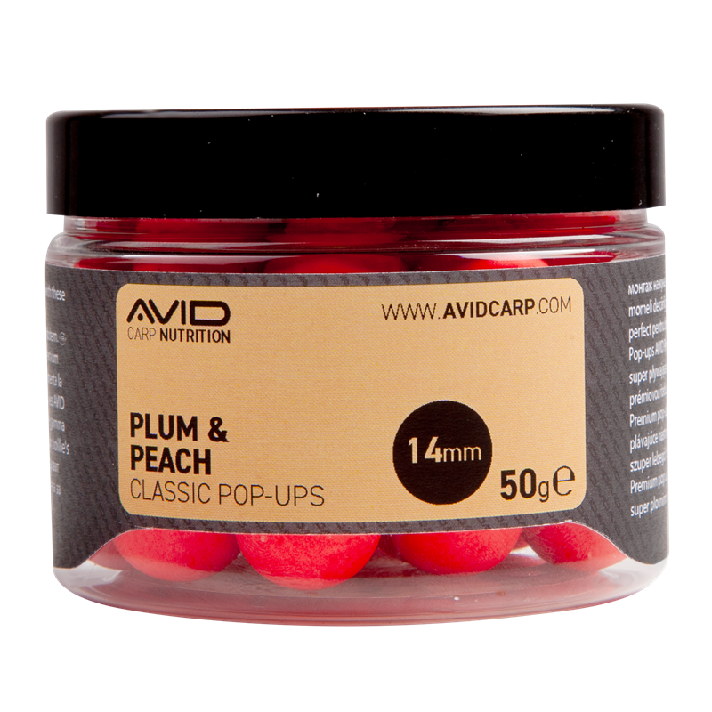 Pop Ups Brand Floats Avid Carp, range Classic, flavor Plum & Peachspecial for carpfishing.